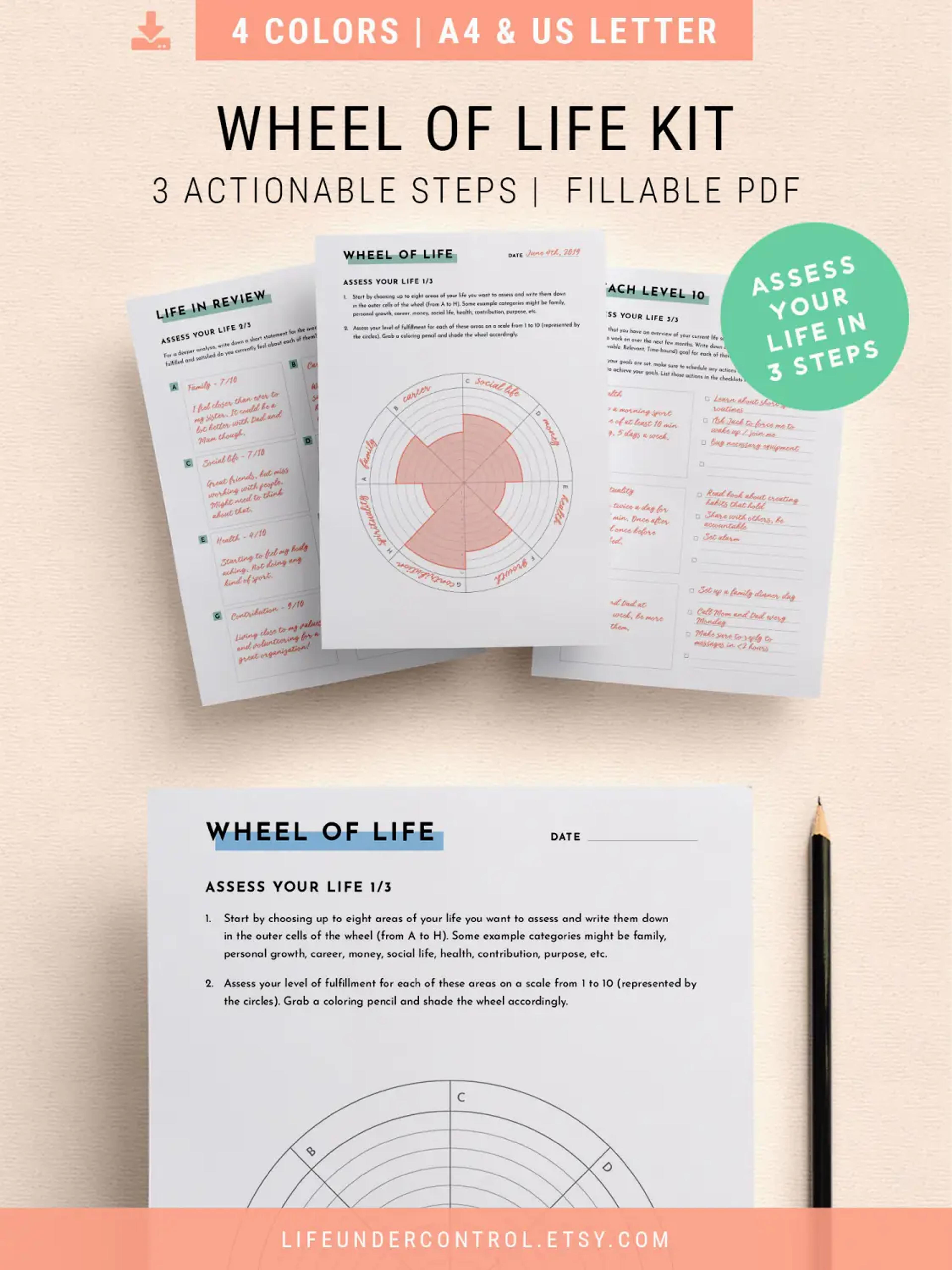 Plan, Take Action and Succeed. Review your entire life with the Wheel of Life kit. This is a 3-step